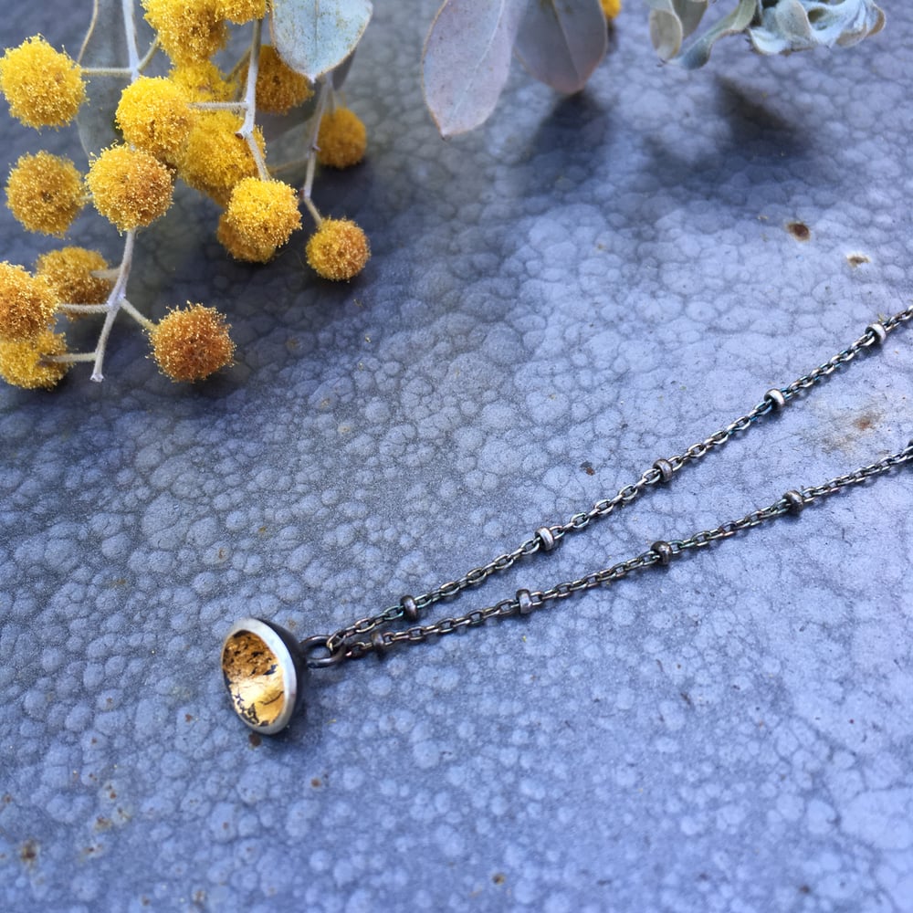 Inspired by the golden glow of the pearl acacia, this pendant features a single droplet of oxidized silver and gold. Hand fabricated from sheets of sterling silver, formed into its effortless shape, it contains a precious pocket of 24k gold leaf and is highlighted by a polished silver rim. This piece perfects an everyday look with simple yet intriguing contrast and organically minimal elements.
