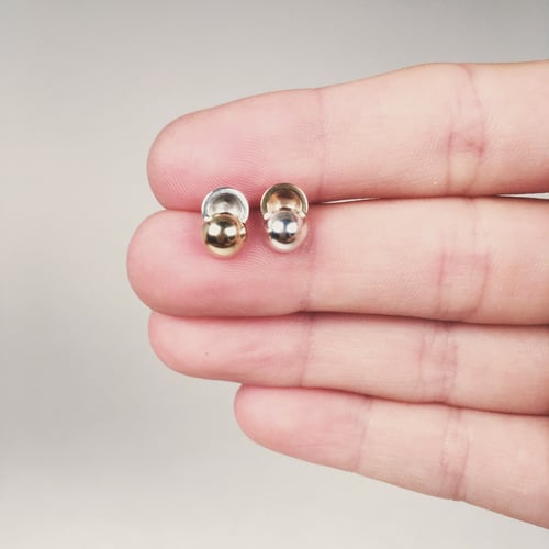 Inspired by the celestial phenomenon of the solar and lunar eclipse, these studs feature overlapping 14k yellow gold and sterling silver hemispheres.