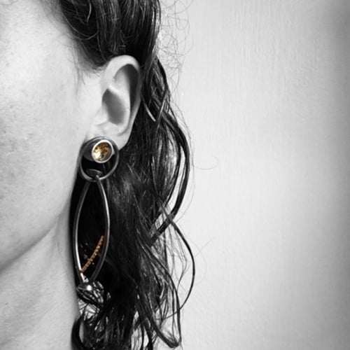 Reminiscent of planets in motion, the Orbit Earrings play off simple lines and the dynamic relationship of moving parts. Hemispheres of glowing 24k gold leaf seem to move along the sterling silver trails freely, and are emphasized by the dark black patina underneath. A perfect pair to make a statement.